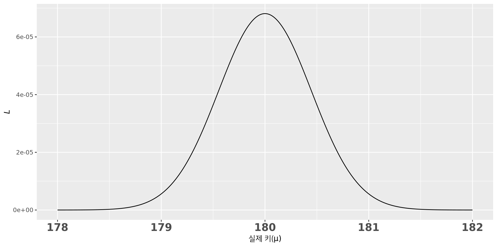 \(L\)이 최대이려면 \((178-\mu)^2+(179-\mu)^2+(180-\mu)^2+(181-\mu)^2+(182-\mu)^2\)이 최소여야 함. \(\mu=180\)일 때 최소.