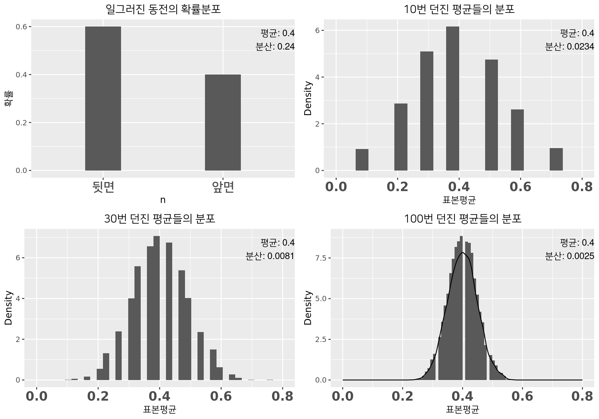 예: \(p = 0.4\) 인 일그러진 동전 여러번 던지기