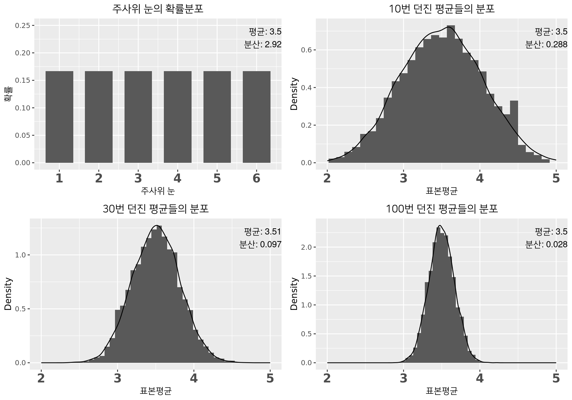 - 주사위눈 평균(\(\mu\)): \(\frac{1+2+3+4+5+6}{6}=3.5\), 분산(\(\sigma^2\)): \(\frac{(1-3.5)^2+(2-3.5)^2+\cdots+(6-3.5)^2}{6}\approx 2.92\)