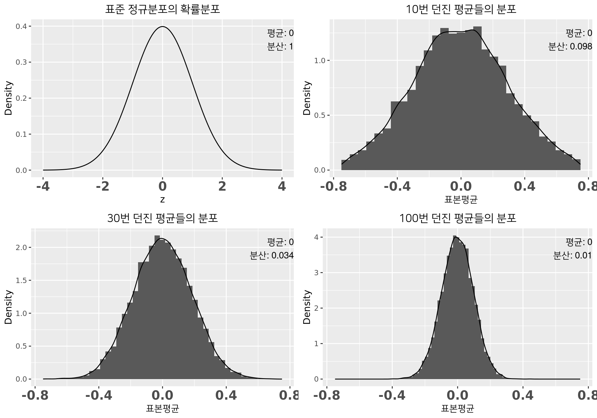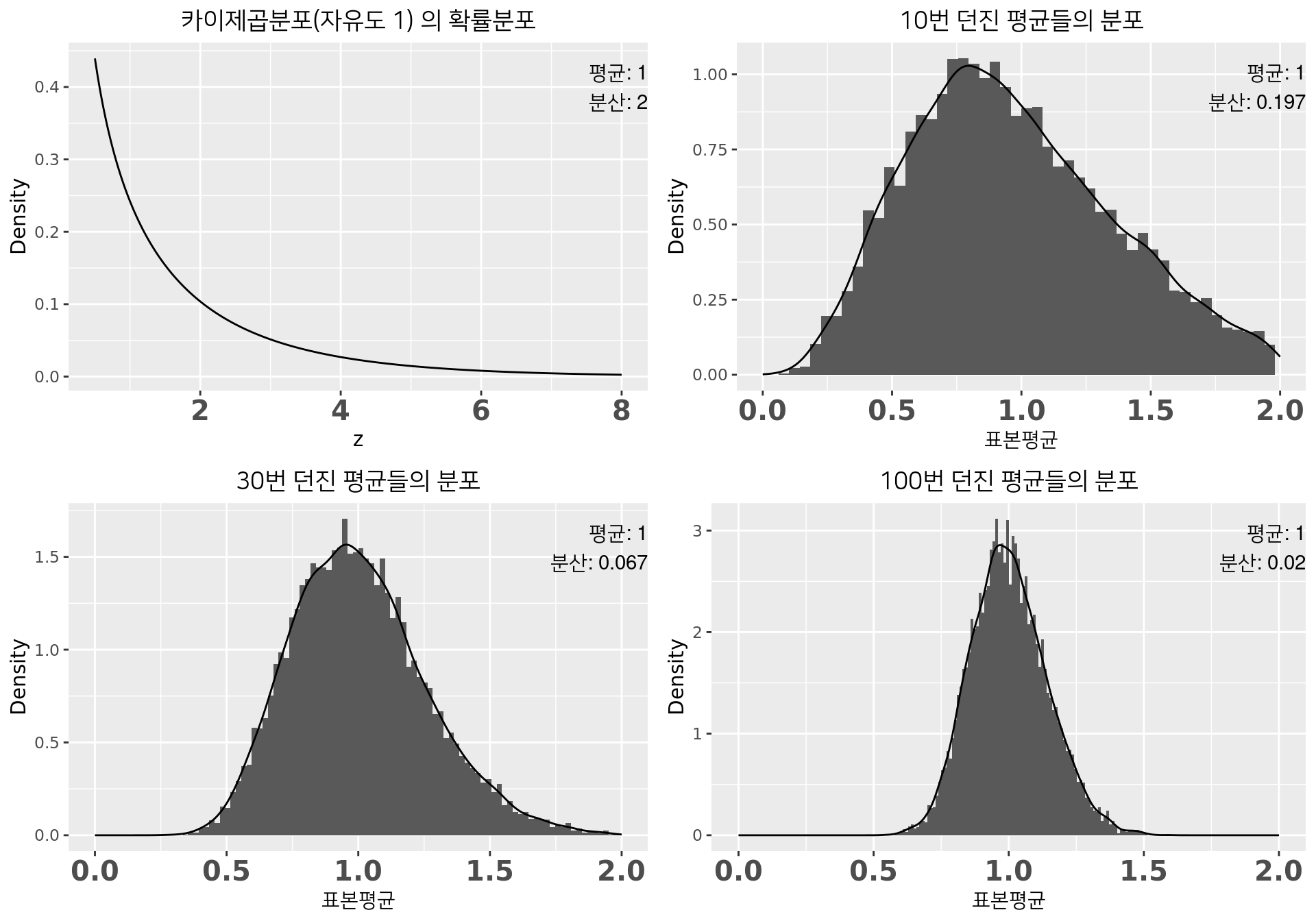 - 표준 정규분포(\(\mu=0\), \(\sigma^2=1\))에서 \(n\)개 뽑아 평균내기