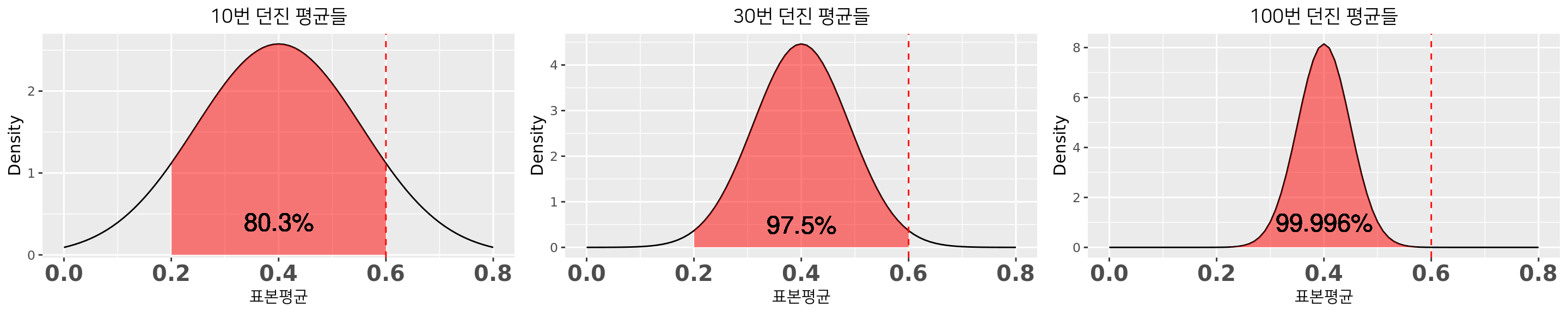- 행위 1: 10번 던져 평균 \(\bar{x}\) 구하는 작업을 10000번 반복. 행위2, 3은 앞과 동일