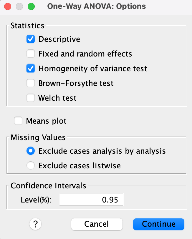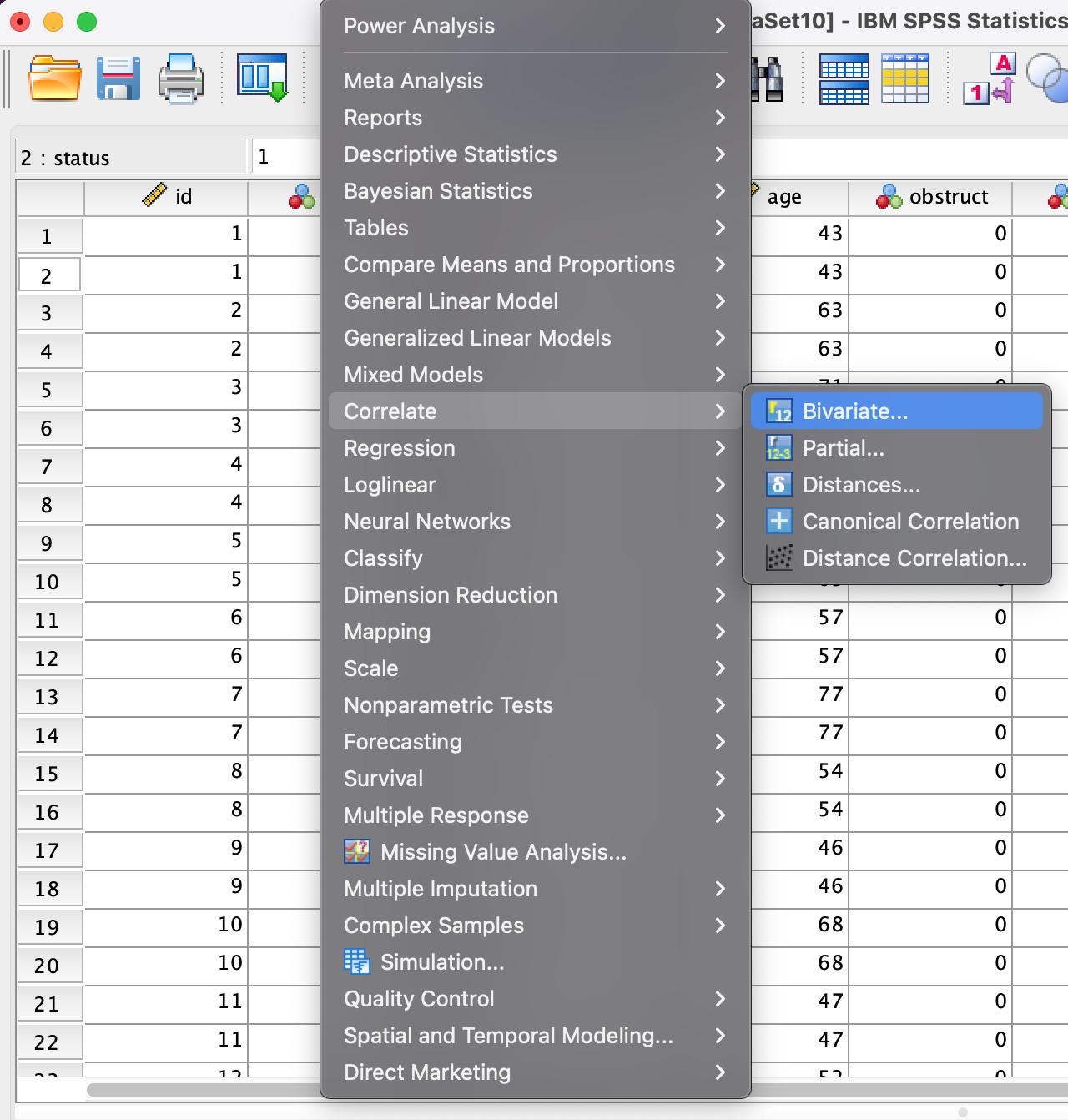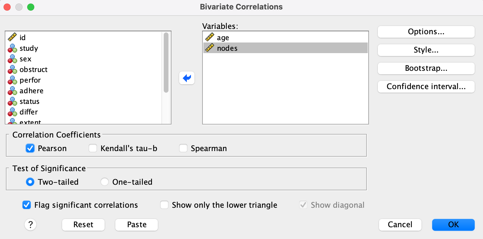 We can also use the Bivariate Correlation function to test linear association between two continuous variables.