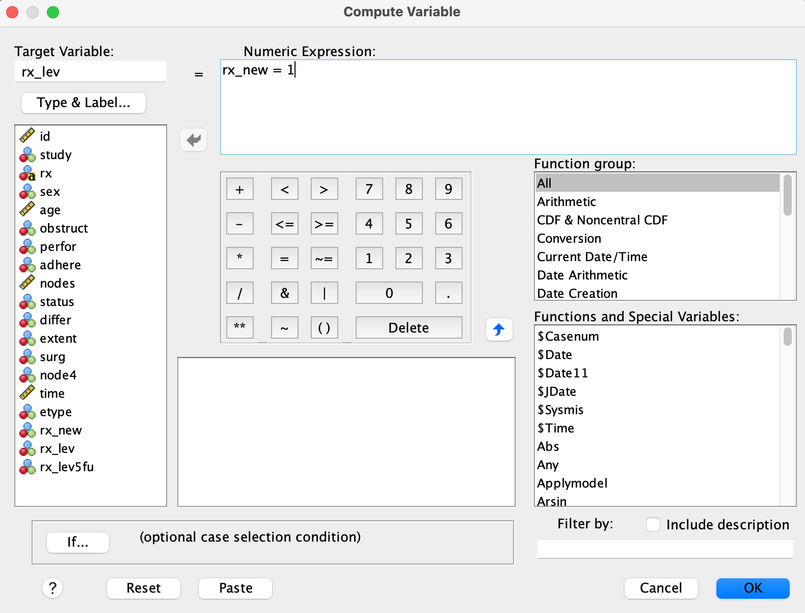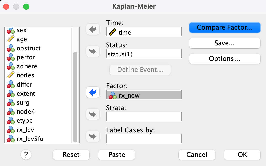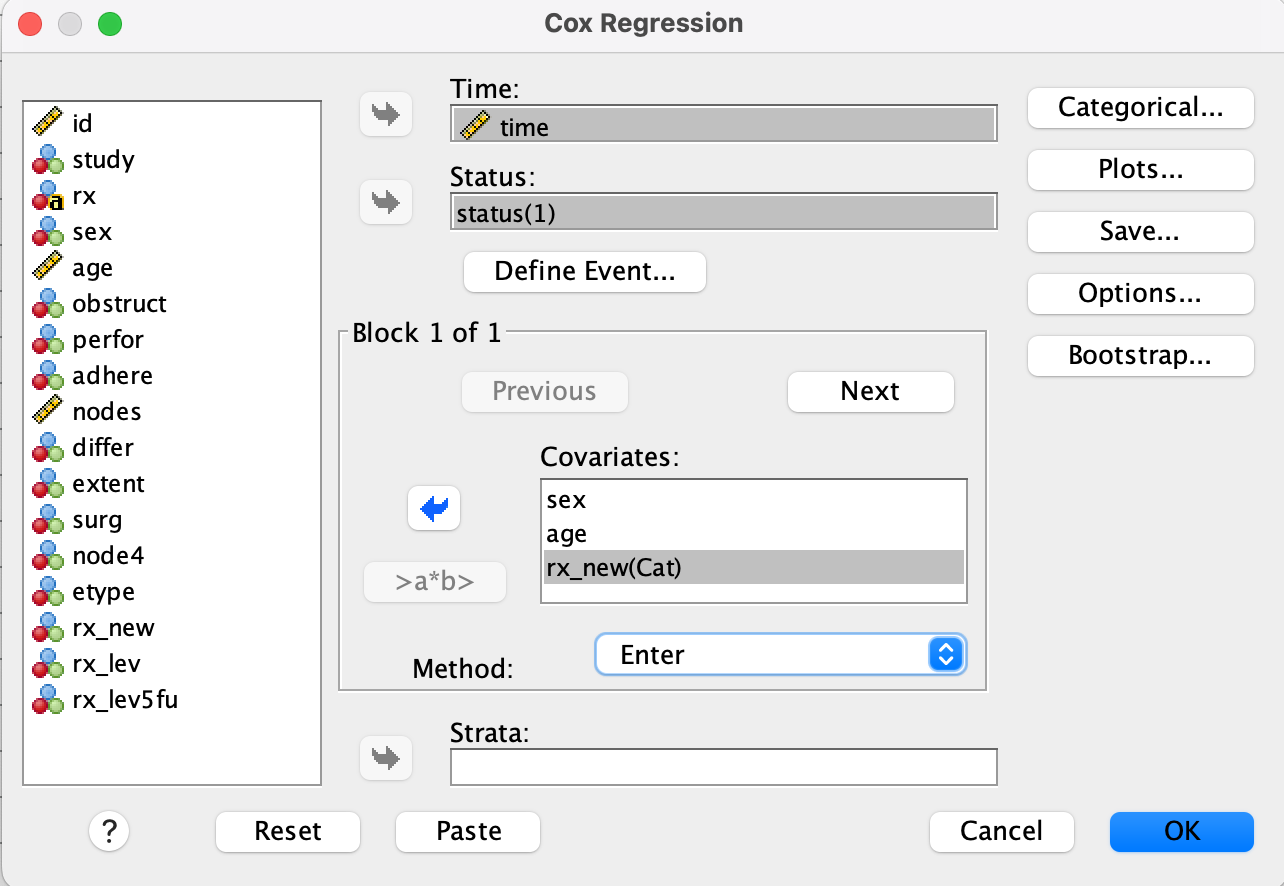 sex, age, rx_new to Covariatesrx_new, set Reference Category to Last, click ChangeExp(B) = hazard ratio