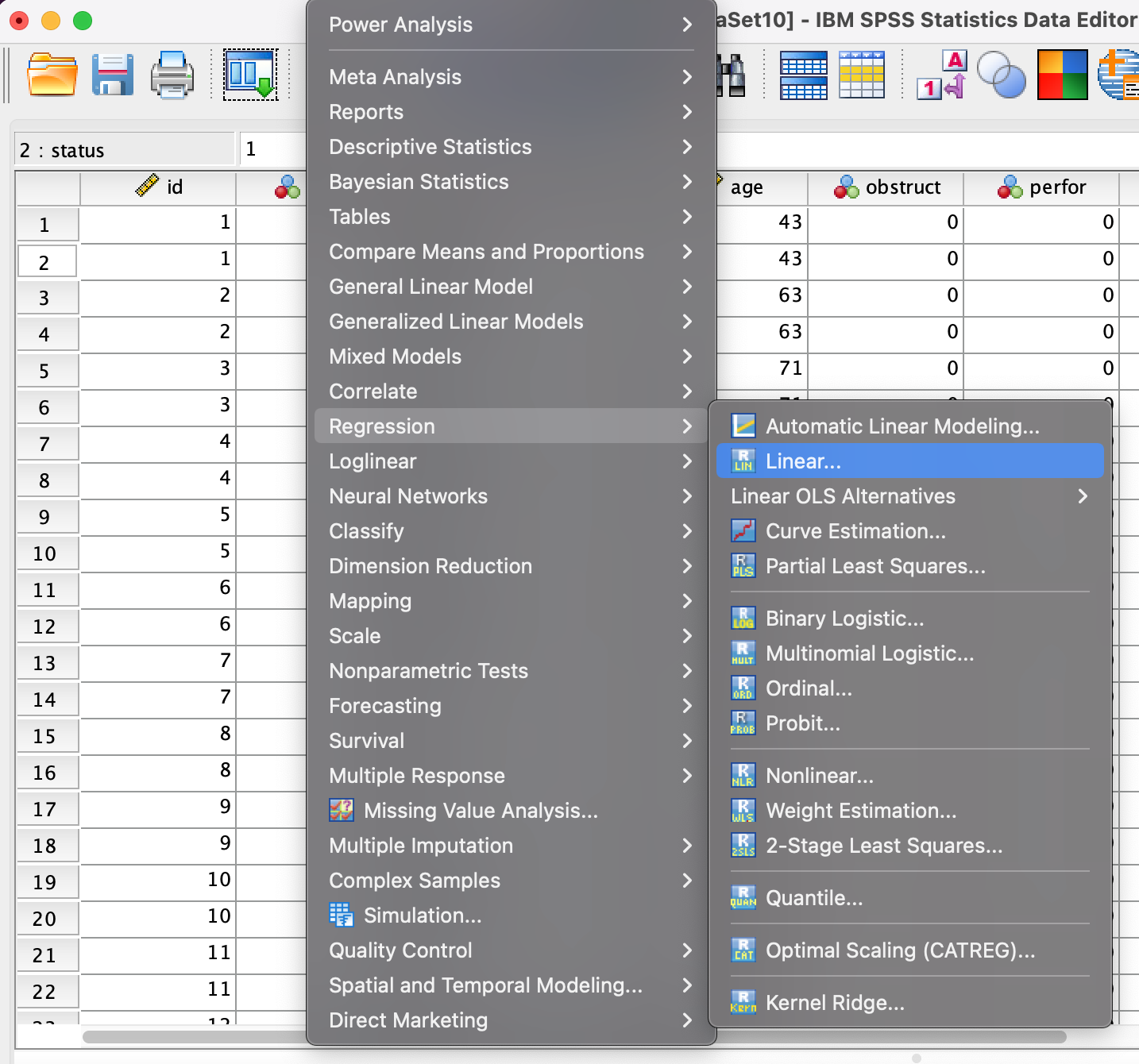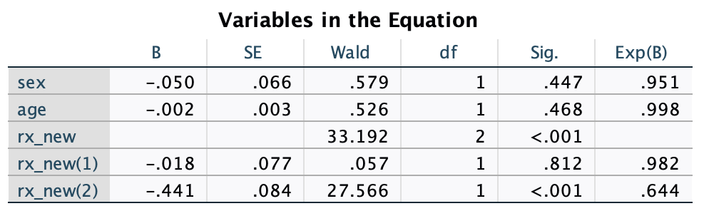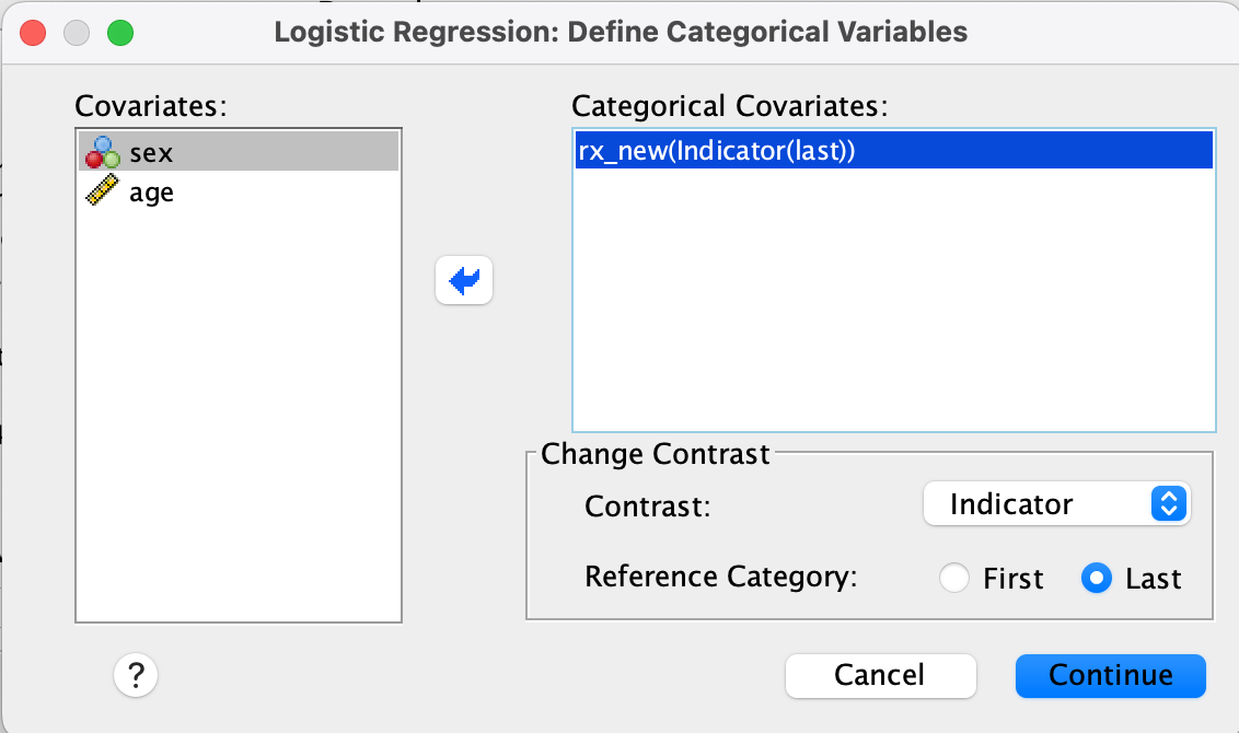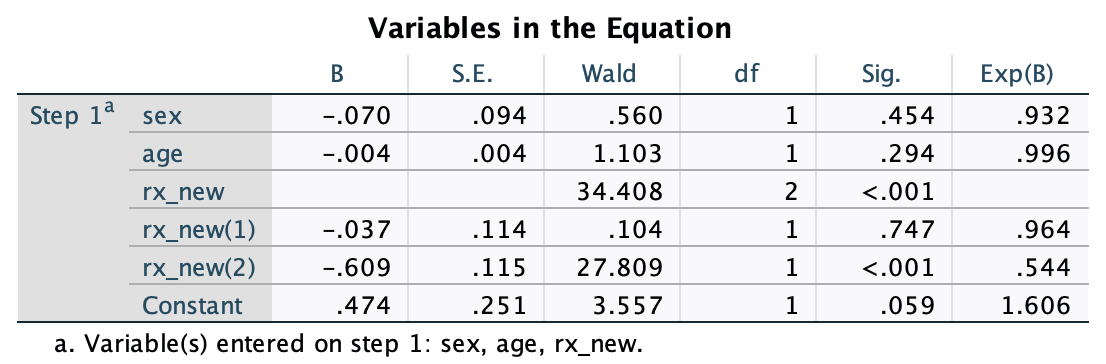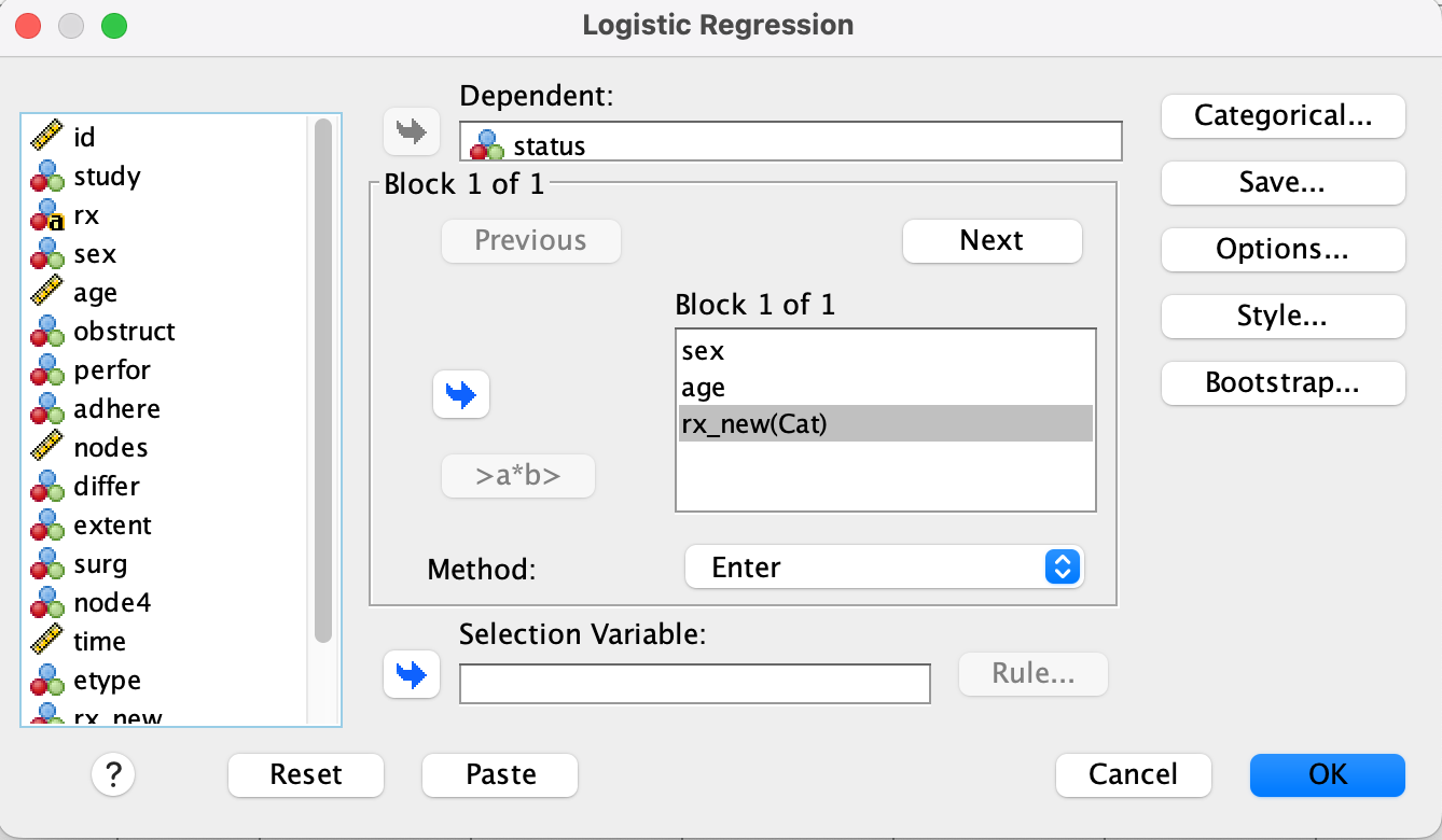 Analyze → Regression → Binary Logistic...status to the Dependent box, sex, age, and rx_new into the Covariates box.