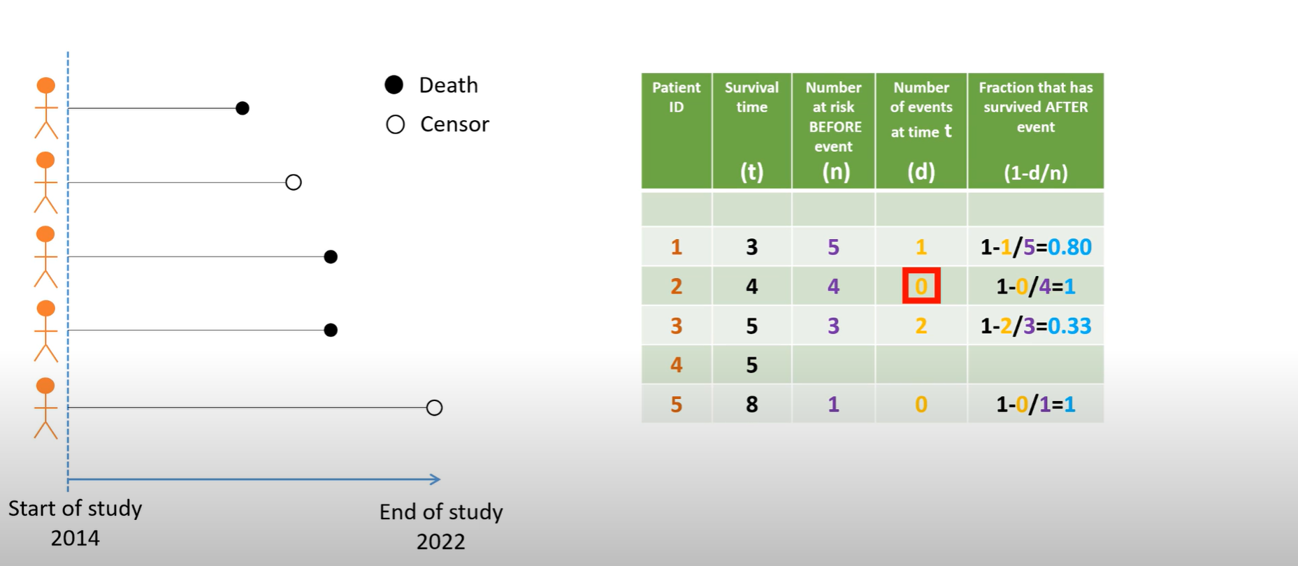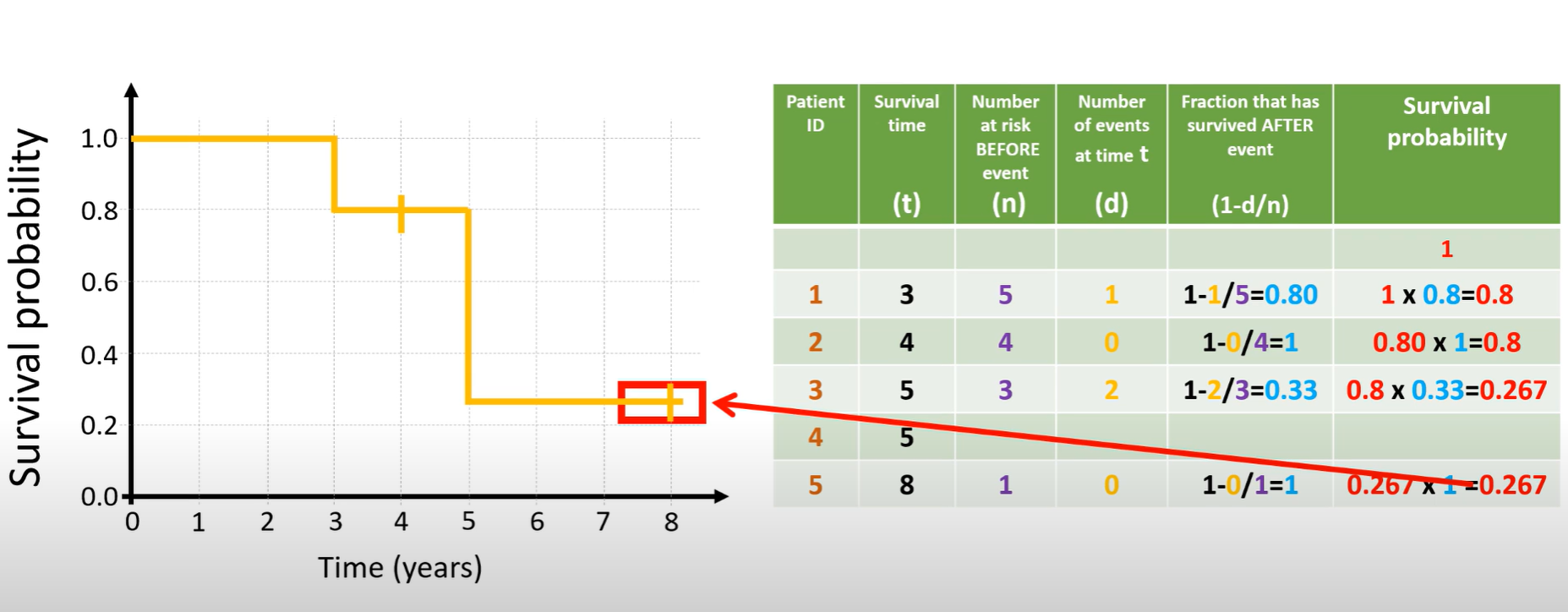 Now apply that idea to the figure. Five people begin. At time 3, one person dies while five were still at risk, so four out of five get past time 3; the curve steps down to 0.80. At time 4, someone is censored. Because no one dies, the curve stays flat at 0.80, but the risk set for later times is now smaller. By time 5, three people are still under observation and two die there; only one of those three gets past time 5, so we scale the curve by one-third, landing around 0.27. At time 8, the last person is censored, so nothing changes numerically—the curve remains about 0.27 through study end.