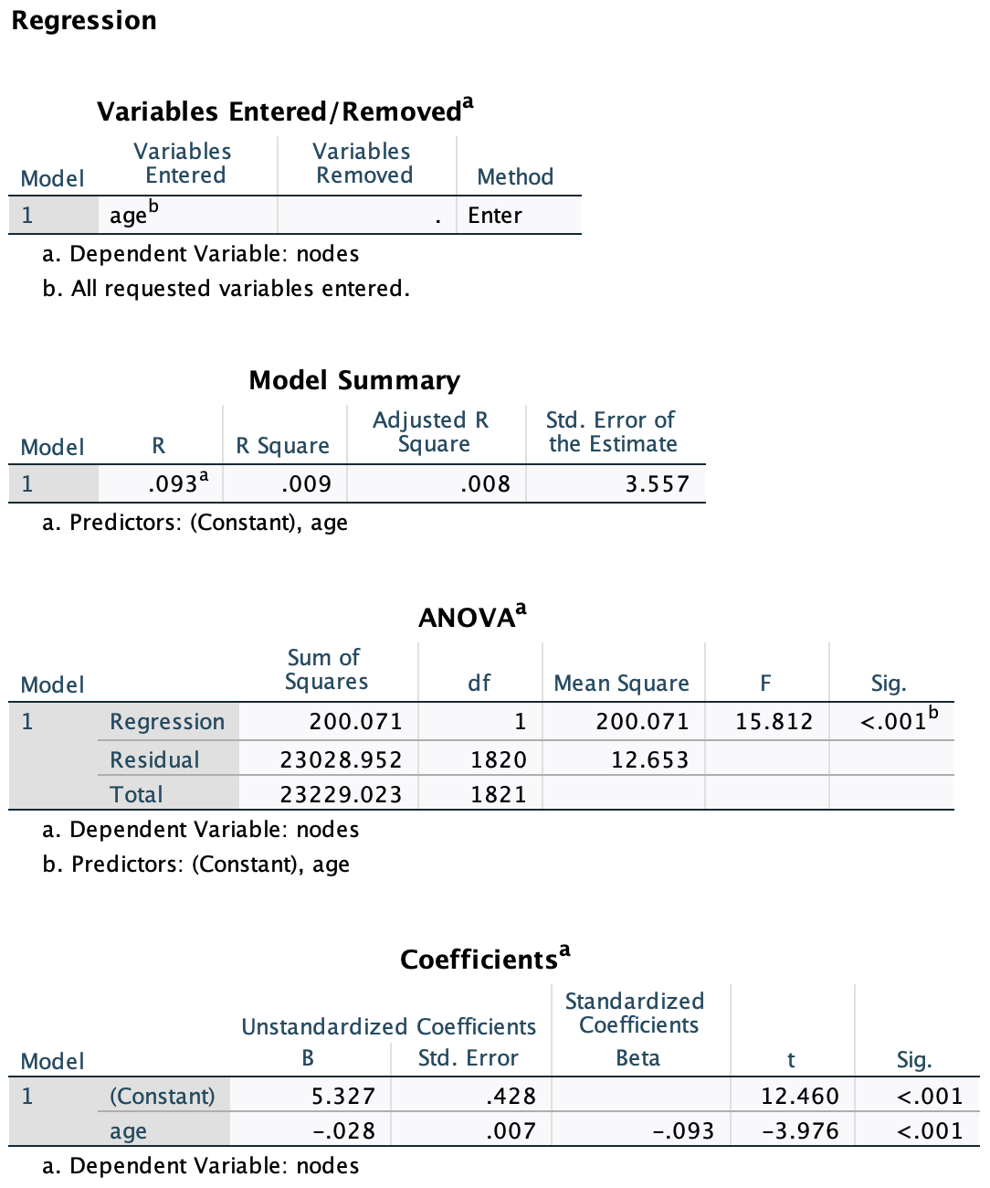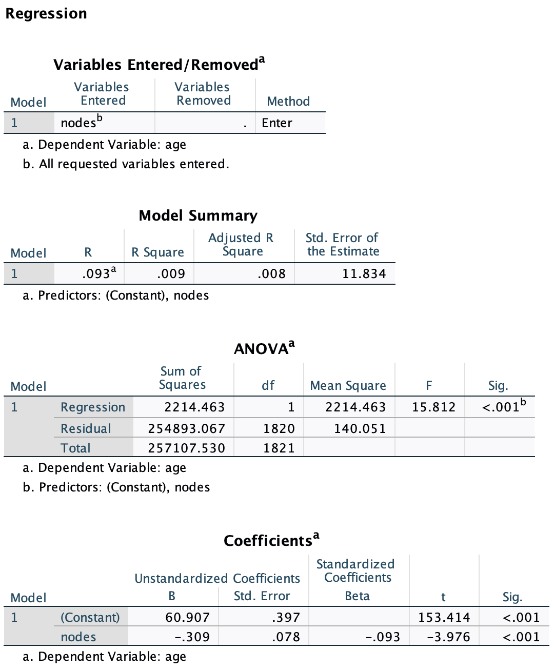 This regression estimates how age affects nodes (number of affected lymph nodes).