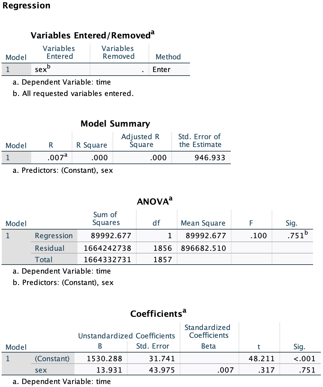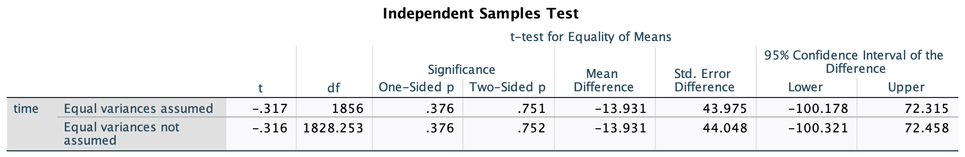 To compare the variable time between male and female groups, use a t-test in SPSS: