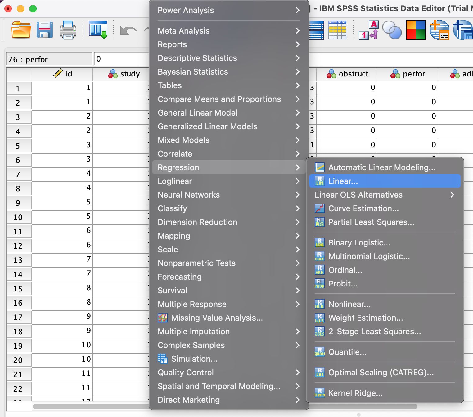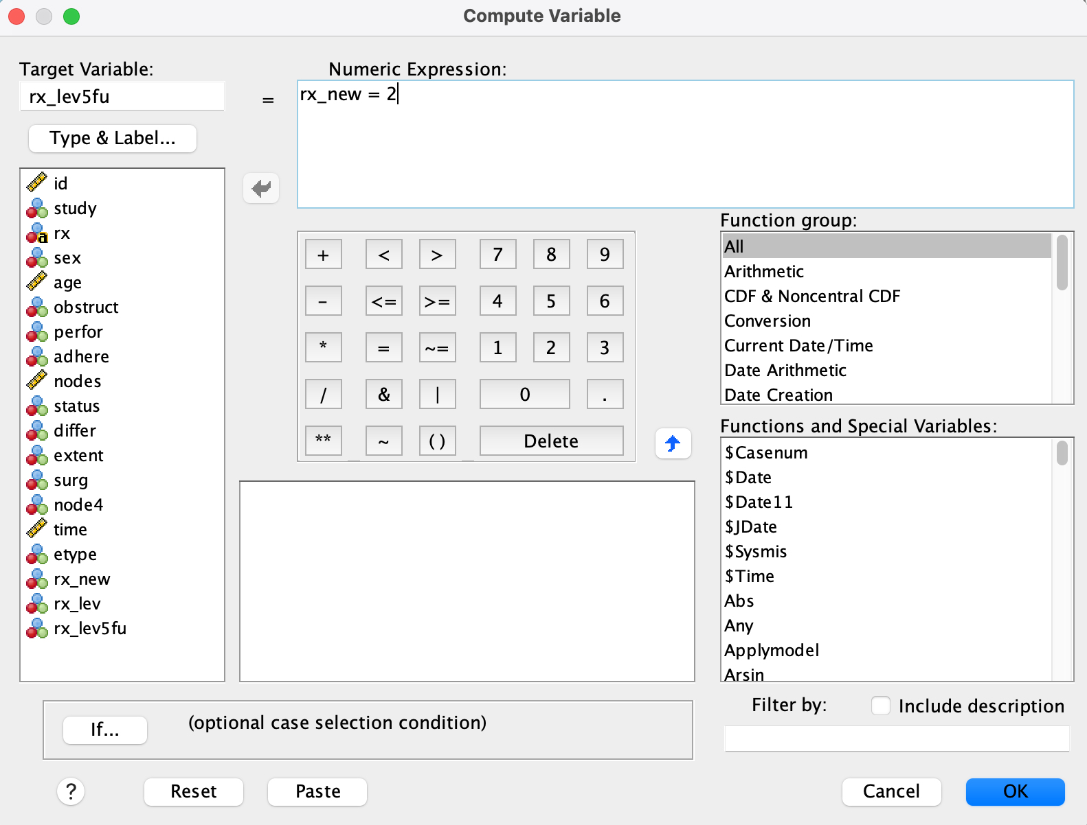 In SPSS, linear regression does not automatically treat string variables as categorical. To include a categorical variable like rx in a regression model, we must first convert it to numeric.